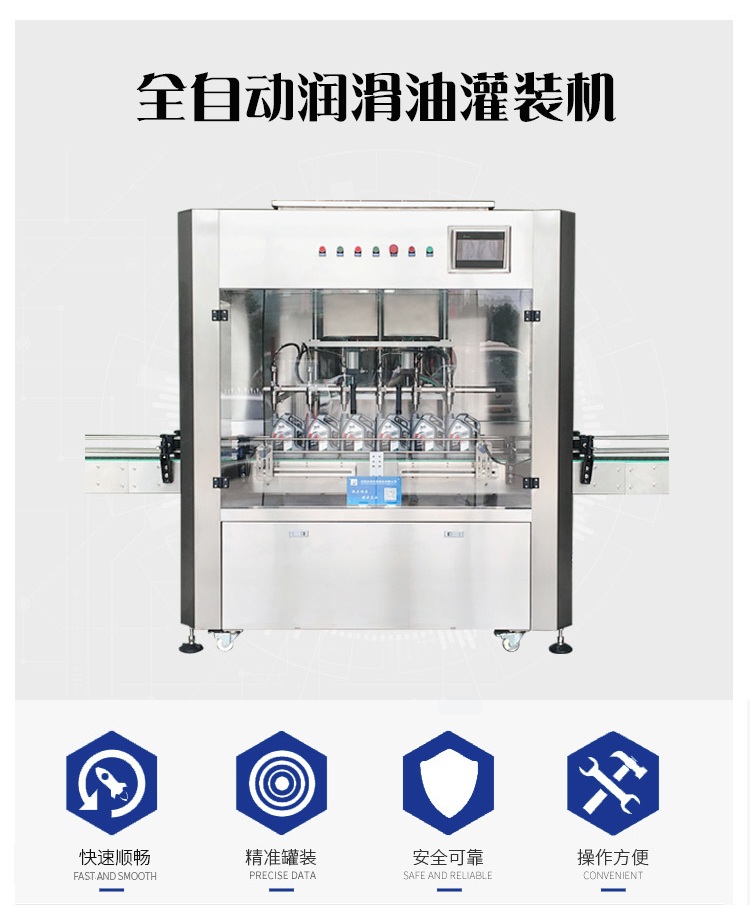 該六頭柱塞式全自動潤滑油灌裝機(jī)獨(dú)特的灌裝頭設(shè)計(jì)及真空回吸系統(tǒng),確保灌裝過程無殘油滴漏,快慢雙速灌裝,灌裝速度可調(diào),杜絕溢瓶現(xiàn)象。