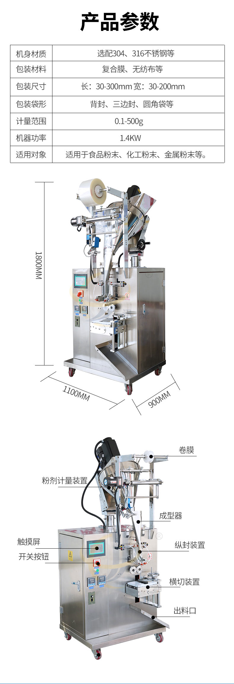 適用于食品行業、日用品行業、生活用品行業。餐飲用品等行業產品包裝如三七超細粉、奶粉、豆粉、中藥粉、調料粉、雞精、鹽、砂糖、等產品。